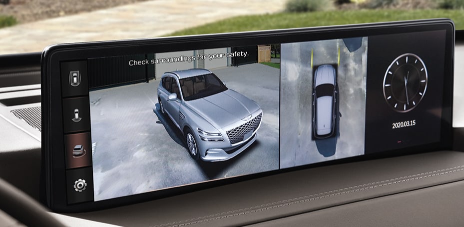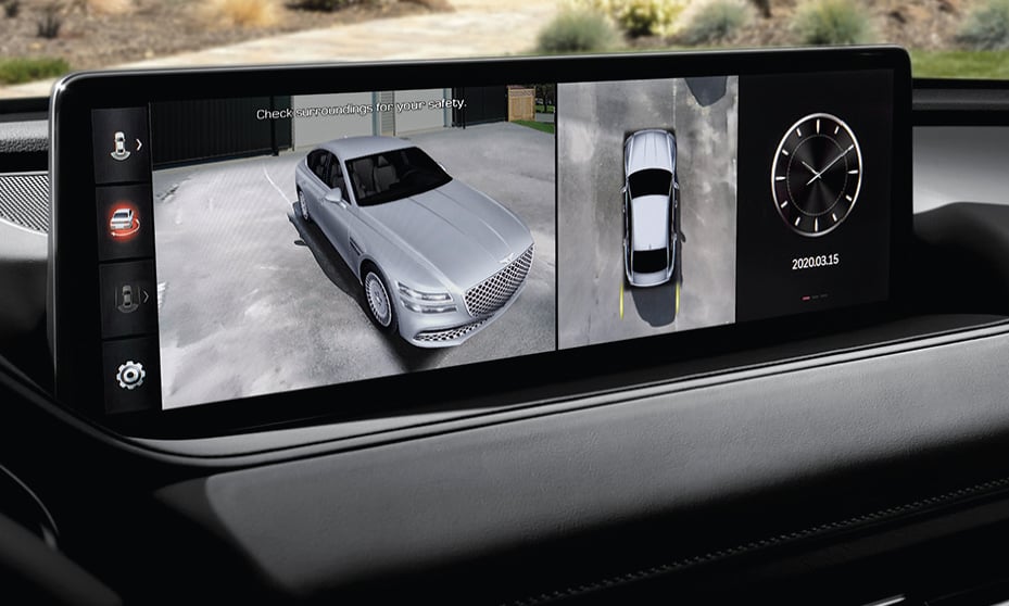Four cameras display the perimeter around your vehicle, helping to guide your way into tight parking spaces and improving your view of the curb when parallel parking. A remote image capture feature even lets you check your G80 or GV80’s surroundings on your smartphone while you’re away.19