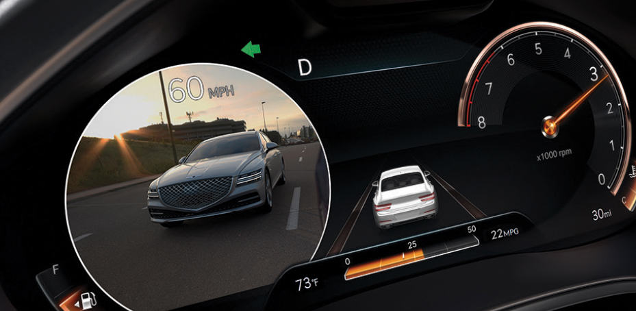 While changing lanes with the turn signal on, your Genesis G80, GV80 or G90 displays video with a rear view of the adjacent lane in the instrument cluster, revealing blind spots not typically seen by traditional side mirrors.12