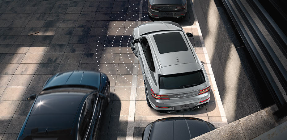 The new G80 and GV80’s Blind-Spot Collision-Avoidance Assist monitors vehicles as far as two lanes over to help prevent collisions when you are exiting a parallel parking spot.20 Before stepping out of your Genesis, Safe Exit Assist warns you if it detects a vehicle approaching alongside an opening door.21